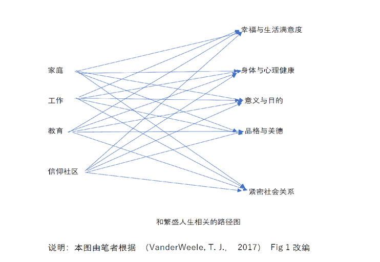什么因素影响和决定人的繁盛? 有学者提出良好的家庭生活、有意义的工作、教育水平和参与信仰社区活动都是影响繁盛的因素( VanderWeele, 2017 )。如图所示,上述四个因素分别都和繁盛人生的五个维度相关联[xviii]。  很明显,在这里教育是影响人的繁盛的一个重要因素,但不是唯一的因素。此外,大量研究表明,认知干预( 表达感恩,想象最好的自己 )、操练美德( 忍耐 )、 行为改变( 向陌生人展现友善 )、积极的社区参与( 志愿者服务 ),良好的婚姻关系等等都是影响繁盛生命的因素( VanderWeele, 2020 )。 也有学者给出人的繁盛-幸福方程式:家庭( Family ),朋友 ( Friends ),Faith ( 信仰 ) 和有意义的工作( Work )( Brooks & Winfrey, 2023 )。